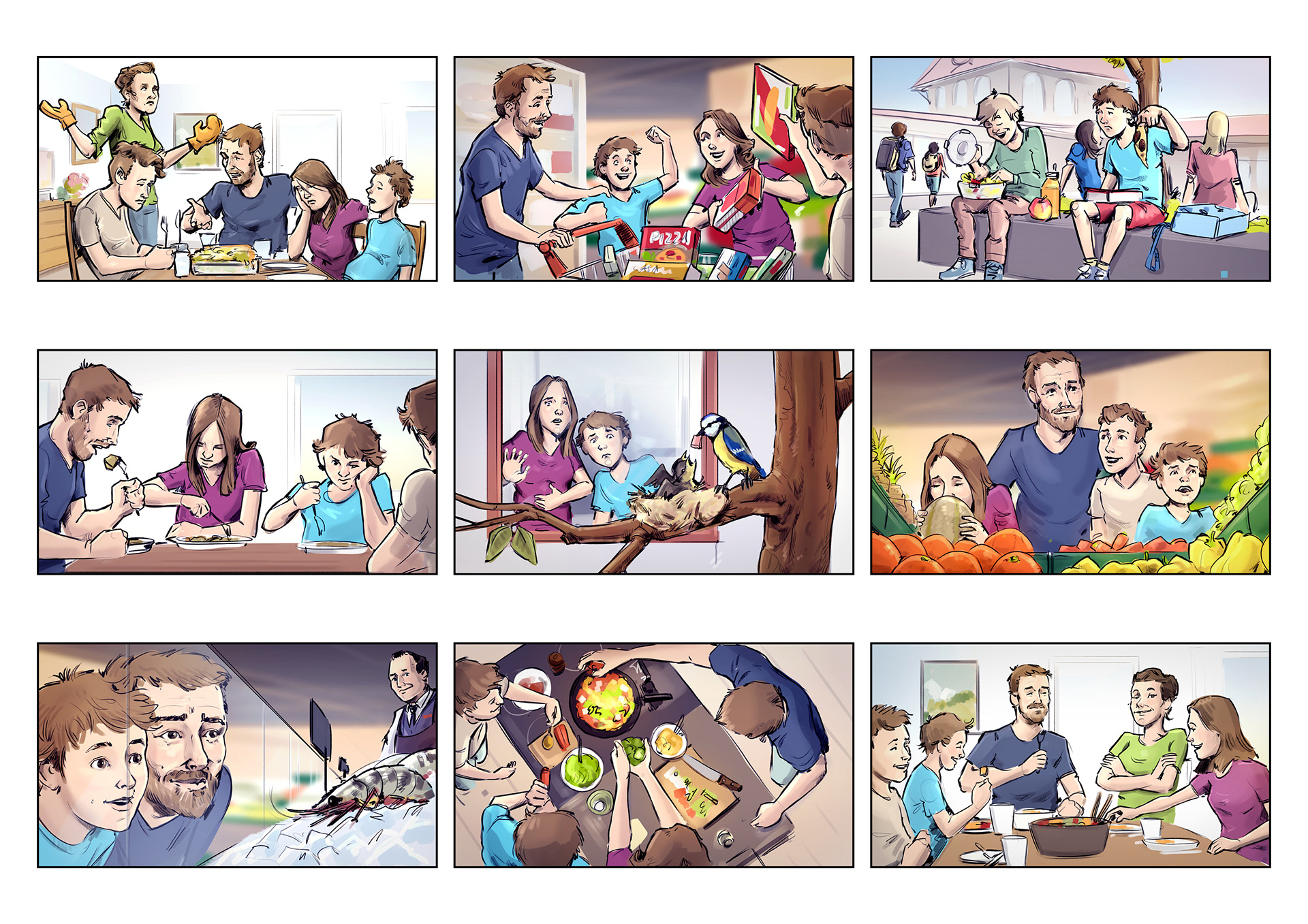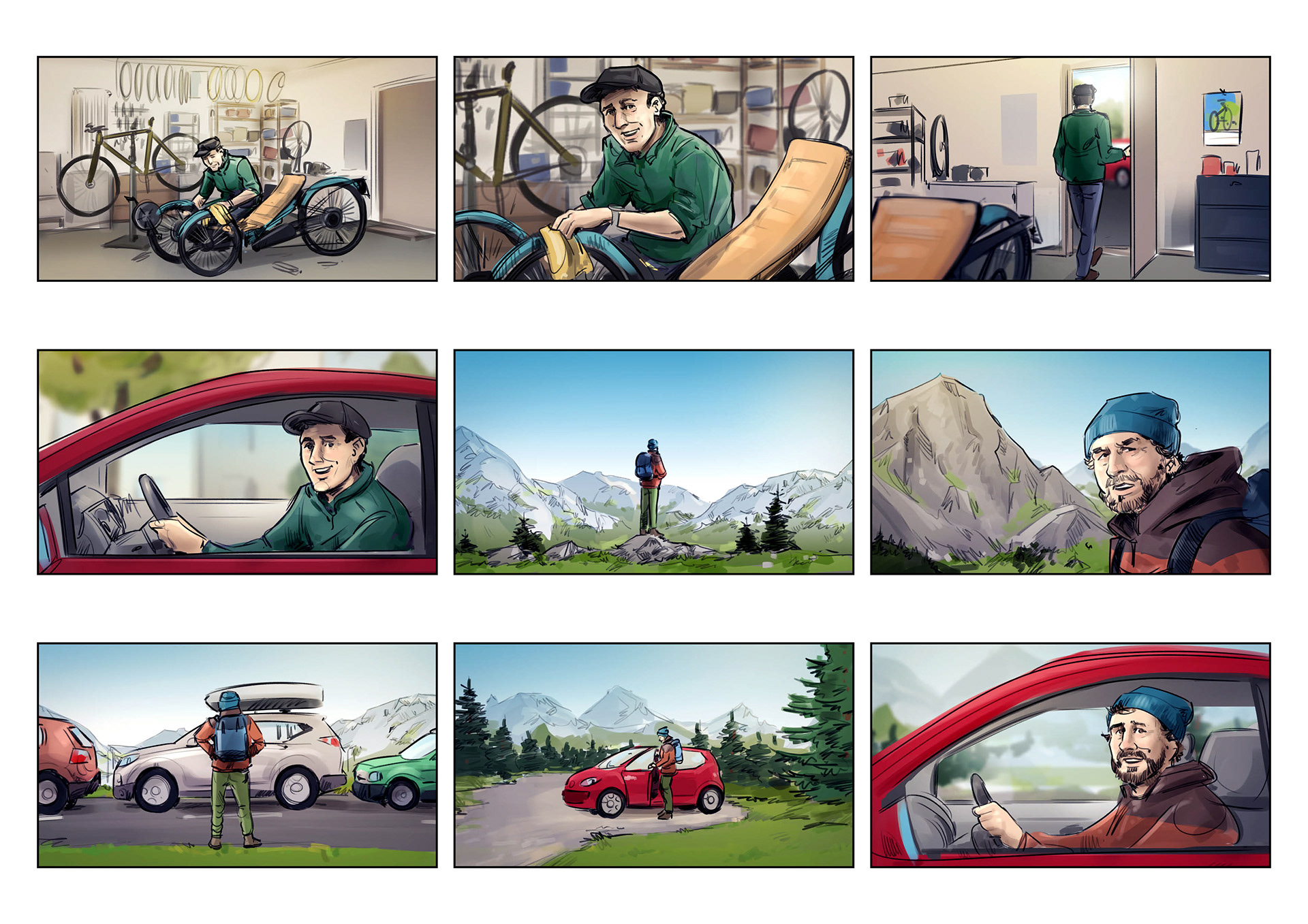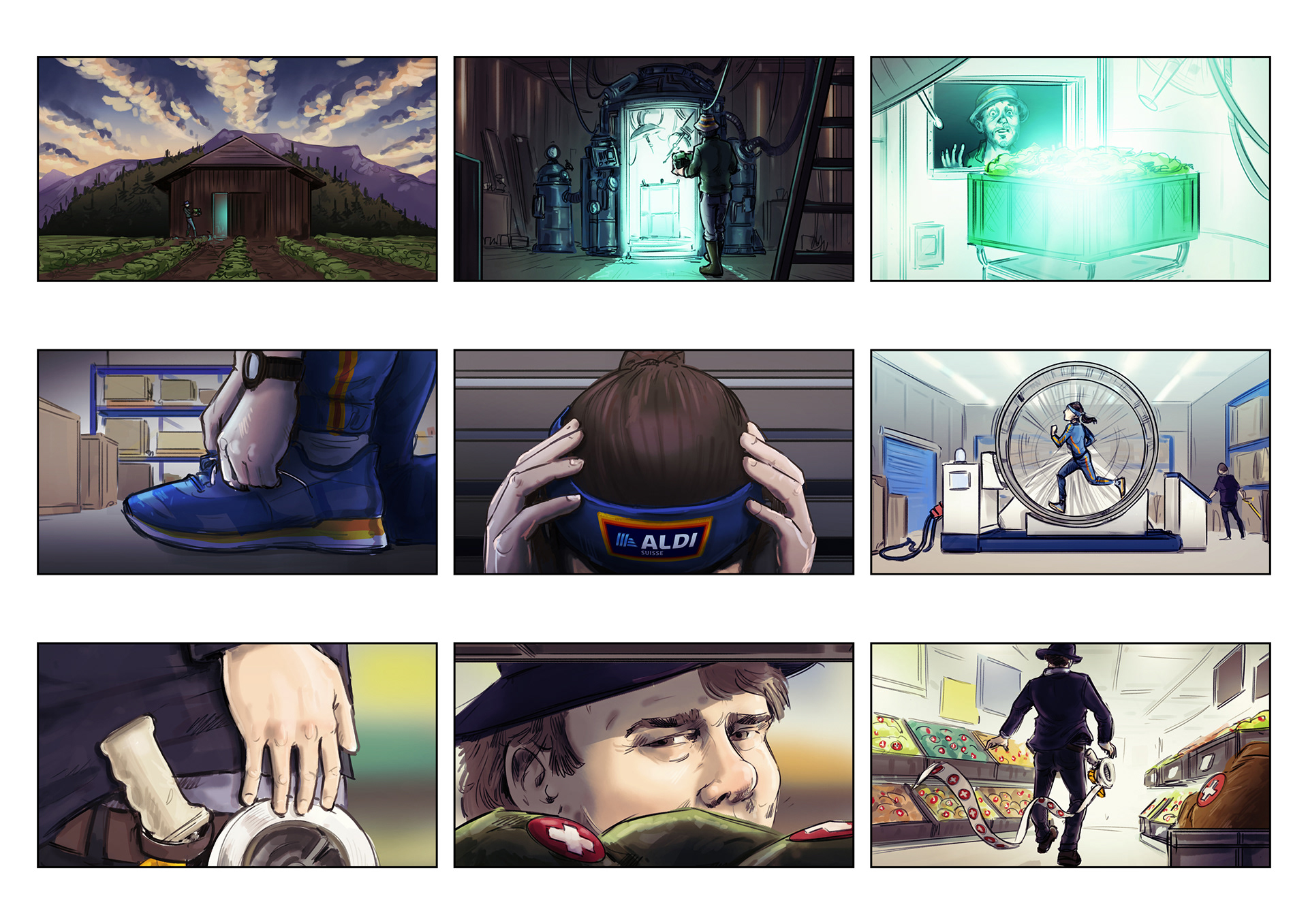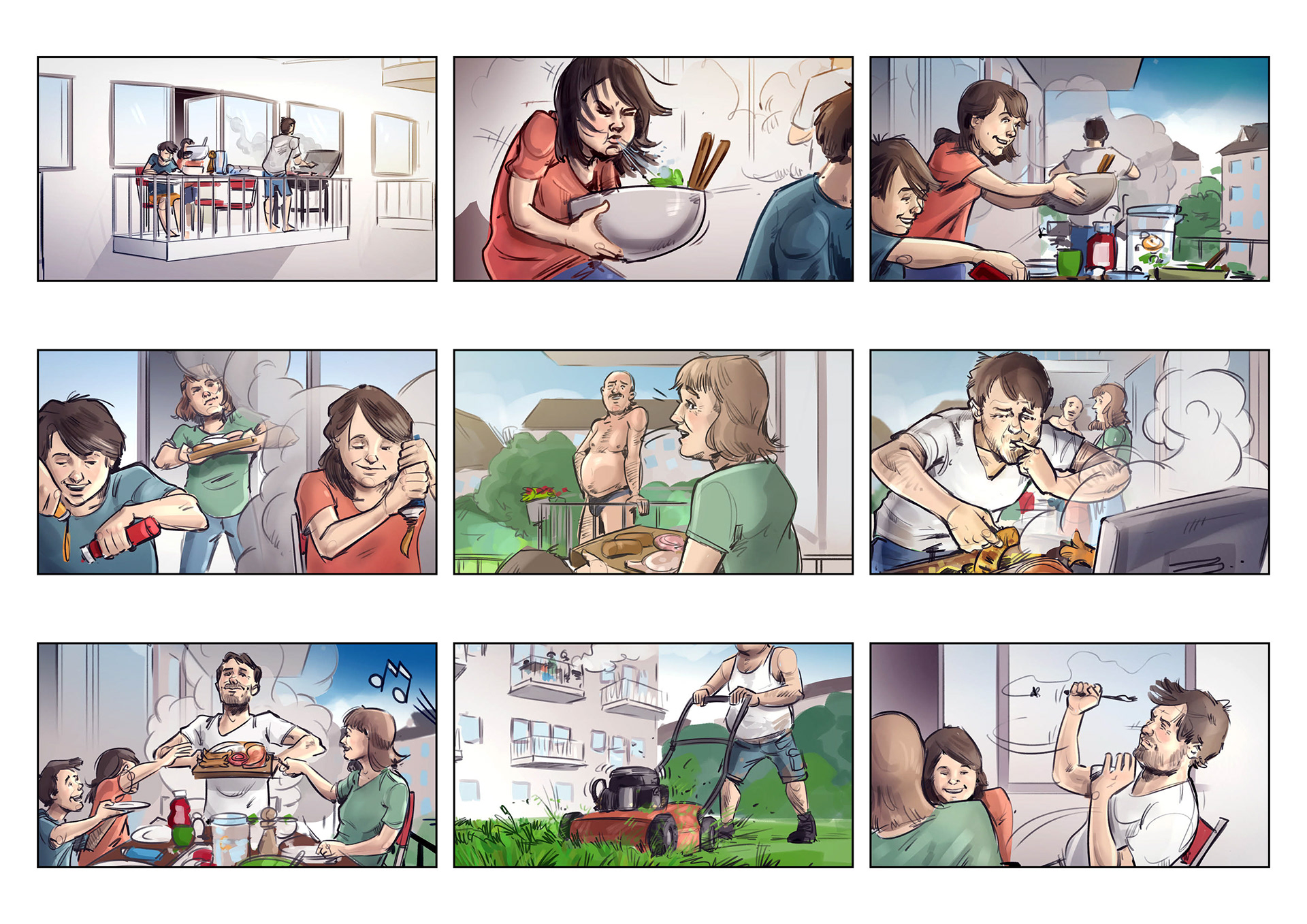 Storyboard and Shootingboards in color. For Keyframes in Agencyboards, Pitches and Animatics.